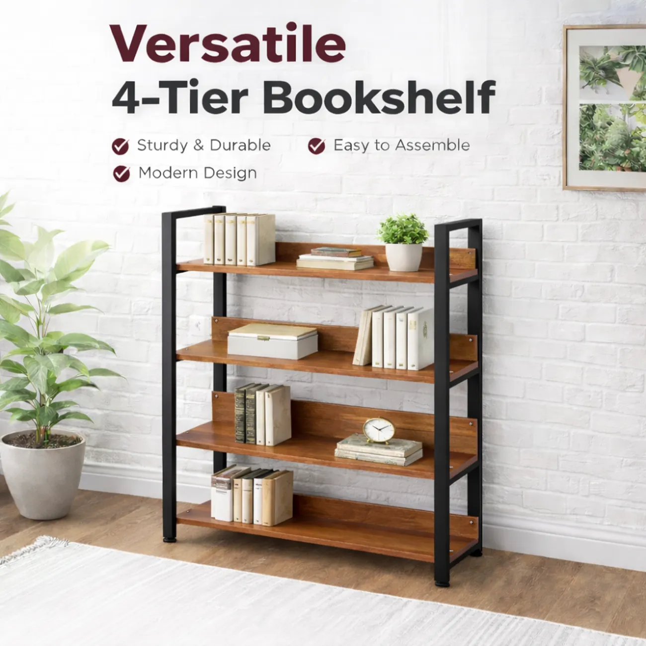 4 TIER STEEL DISPLAY RACK – WOODEN SHELF STANDING RACK – BOOKSHELF