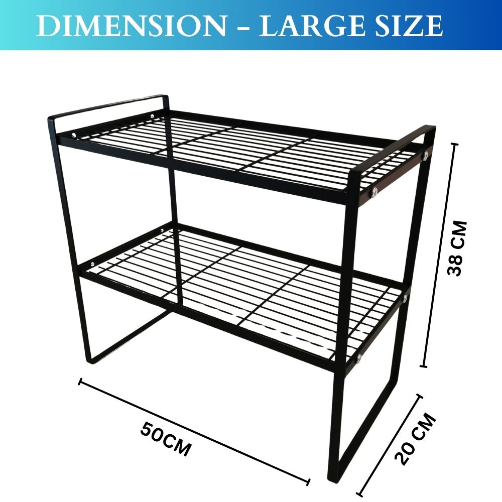 The 2 layer kitchen counter rack is a versatile multipurpose storage solution for your kitchen. Made from heavy-duty steel with a rust-resistant black coating, it provides durability and a modern look. The 2-tier design helps maximize vertical space, making it perfect for kitchen countertops, pantry storage, spice rack setup, dish storage, and even small kitchen appliances.