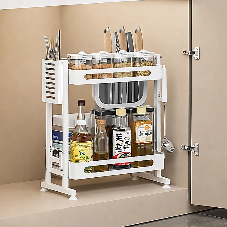 • 2 Layer Kitchen Spice Rack stores common cooking tools in an easy to reach place.