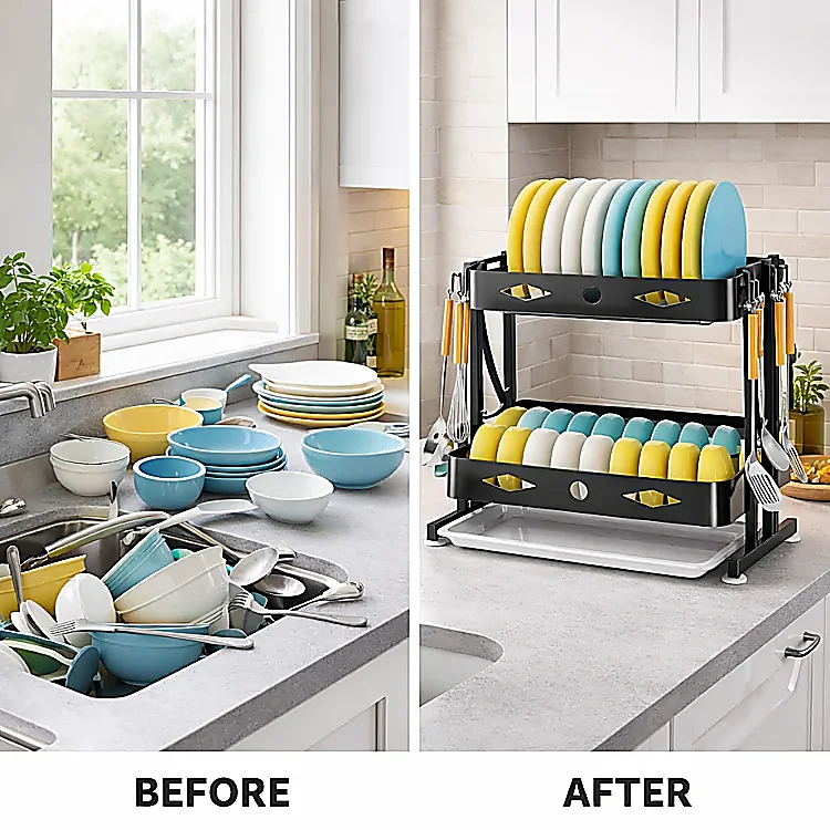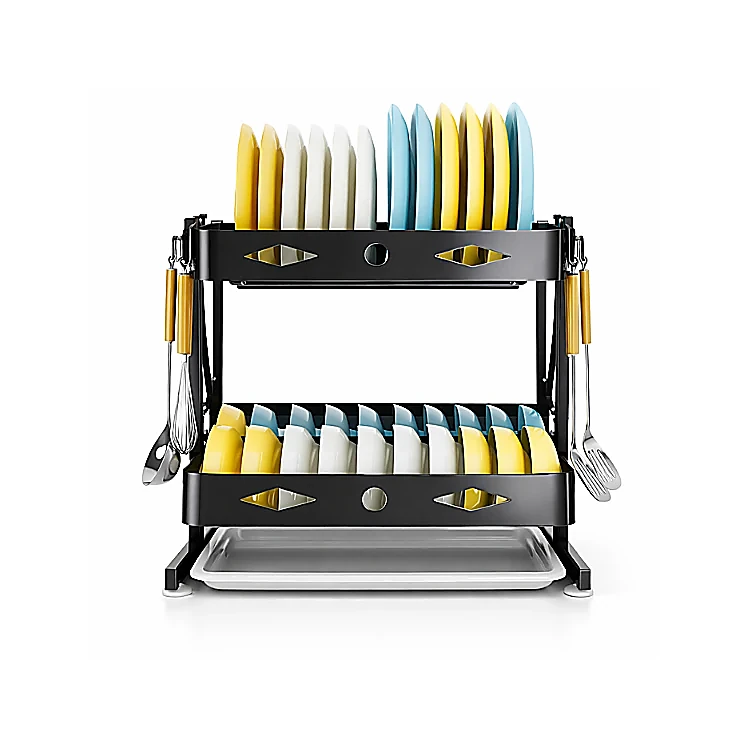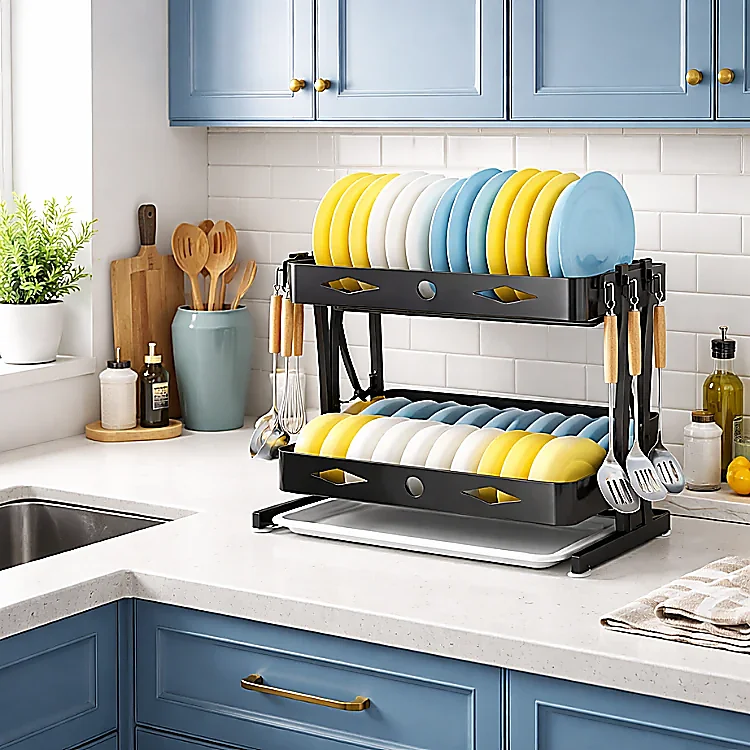 - Structure: 2-tier foldable dish rack design