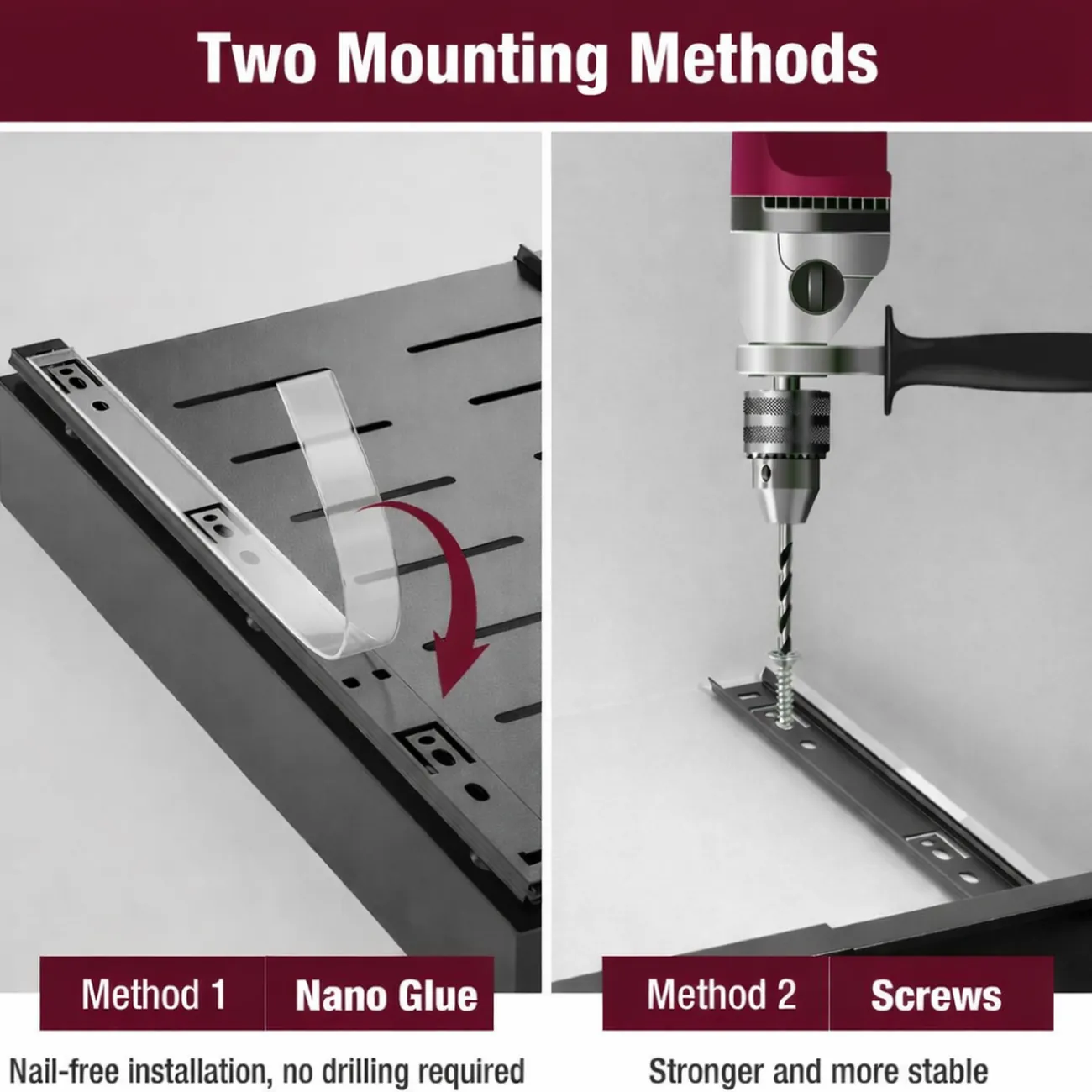 Installation is flexible — choose strong adhesive mounting (no drilling required) or screw installation for extra stability.