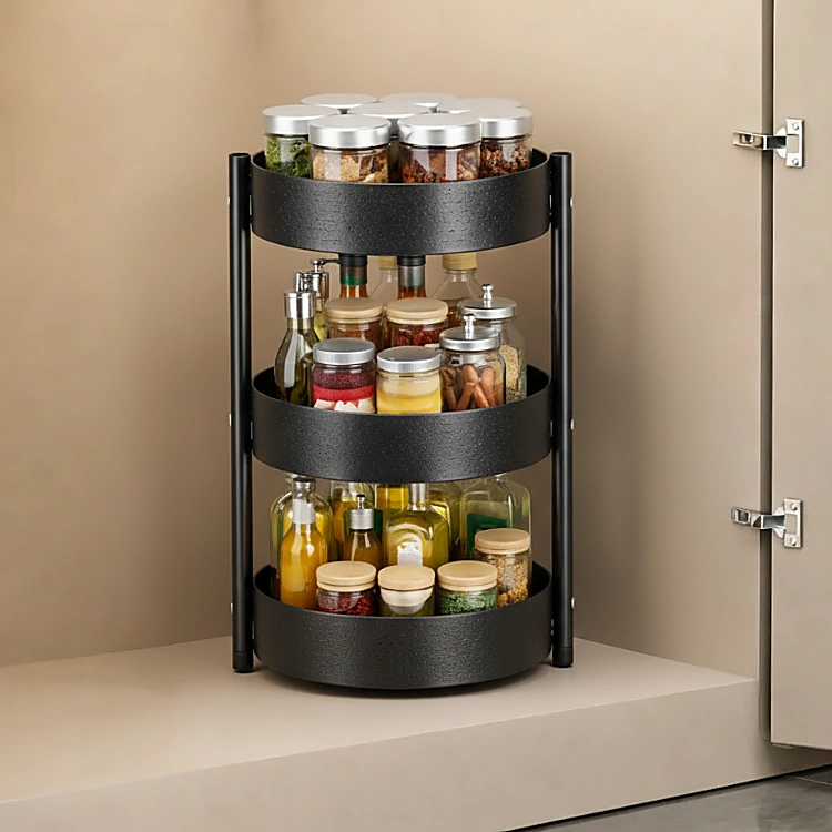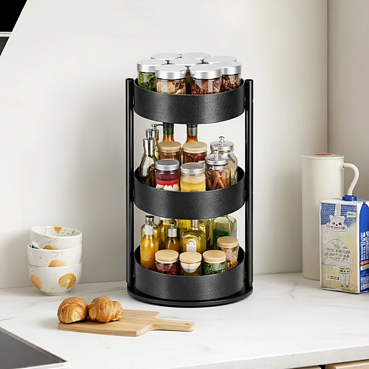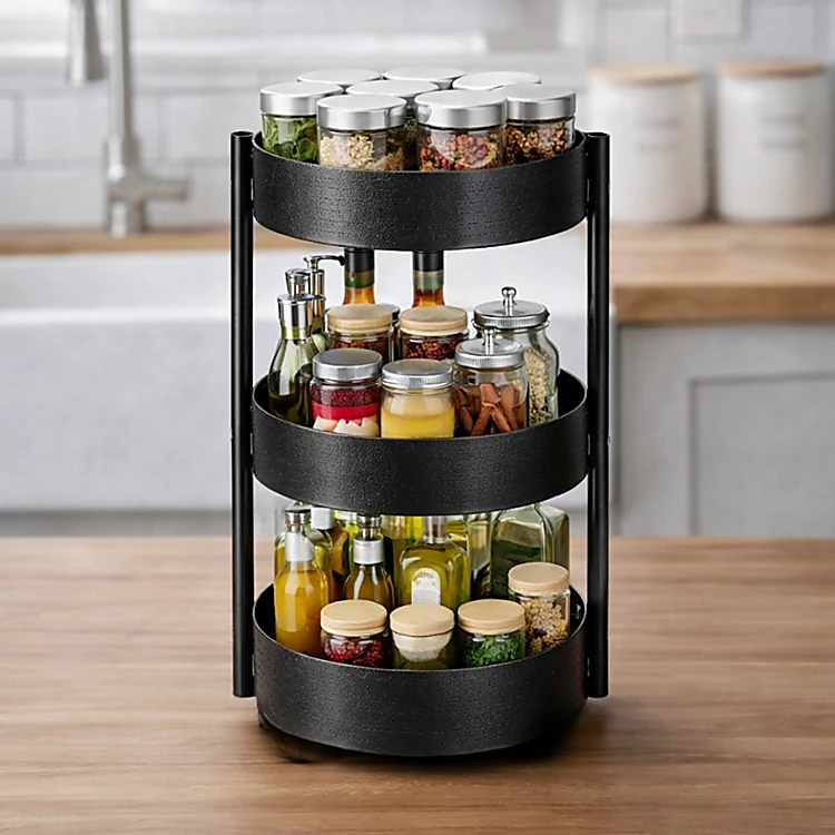 appearance. The three-tier circular design provides generous storage space for spice jars, sauces, oils and condiments while helping keep your kitchen countertop or cupboard tidy.