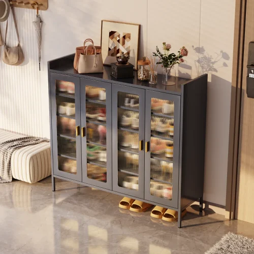 4-DOOR GREY SHOE CABINET – 6 TIER METAL STORAGE WITH FULL FLUTED GLASS FRONT