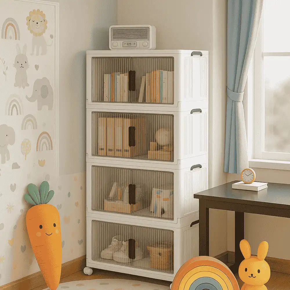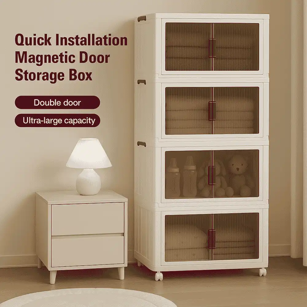 4 TIER PLASTIC STORAGE BOX, 45 CM LENGTH, WITH 2 PULL OUT DOOR AND MAGNETIC LOCK, FOLDABLE PLASTIC STORAGE, KIDS TOYS AND CLOTH STORAGE CABINETS