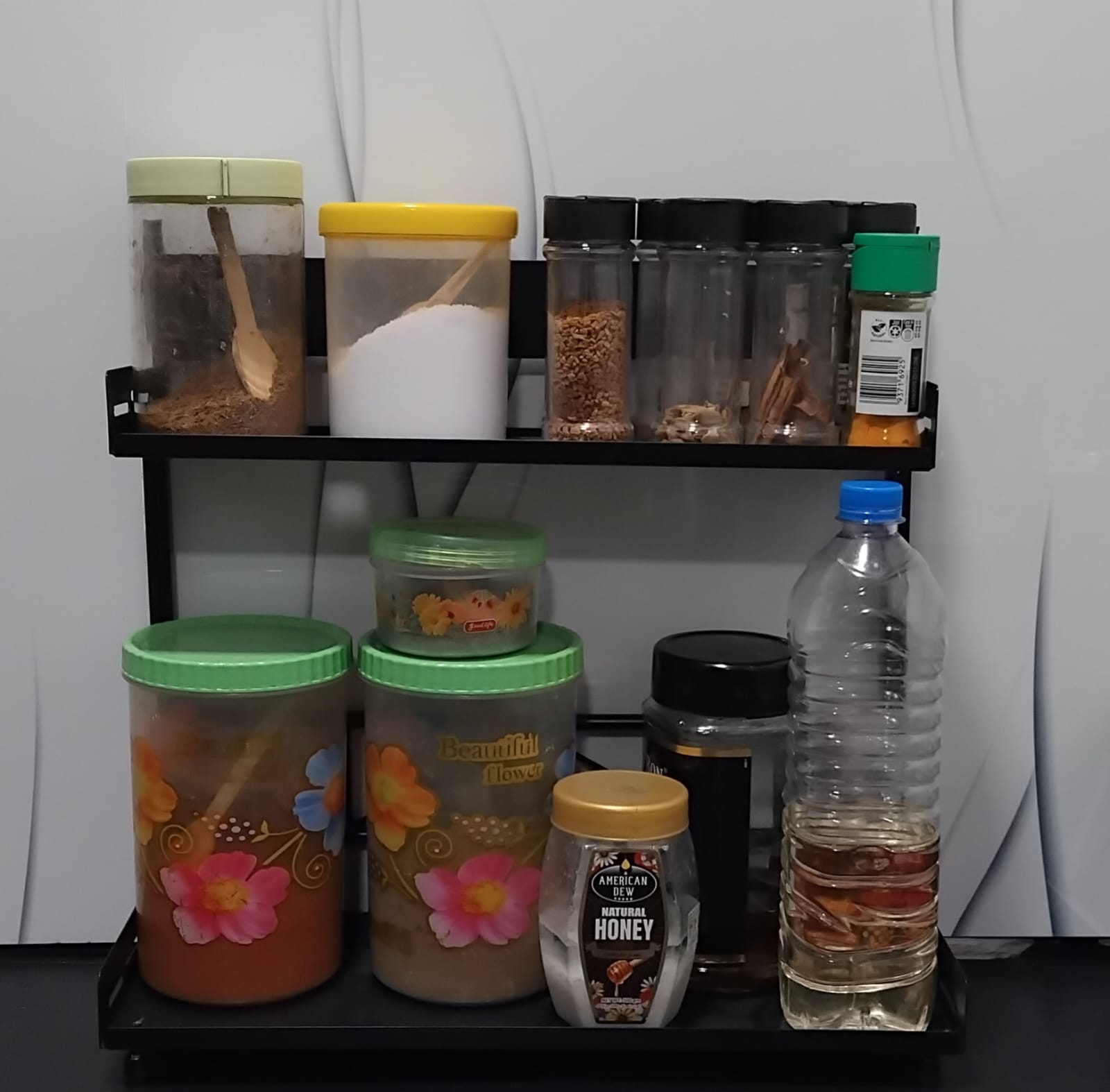 - Structure: Two-tier spice rack with adjustable shelf
