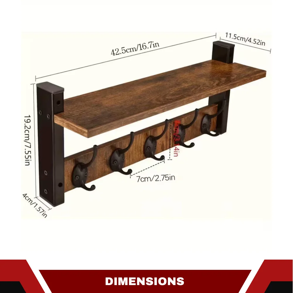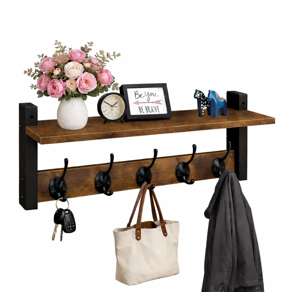 Whether you need a coat hanger for wall, a wall key holder or an entryway hanging shelf to keep essentials neatly in one place, this multipurpose rack is built for daily use. The top wooden shelf is perfect for décor items, perfumes, small plants, frames or storage baskets, while the 5 heavy-duty hooks can easily hold clothes, hats, towels, purses, robes, backpacks or keys.