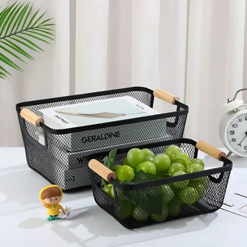 BLACK MESH WIRE BASKET – SLEEK & STURDY METAL STORAGE WITH WOODEN HANDLE