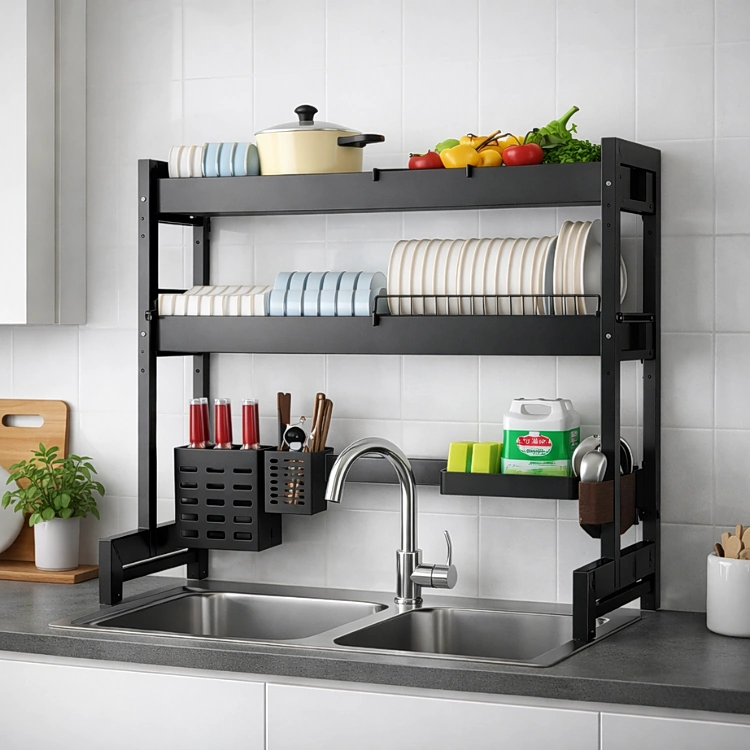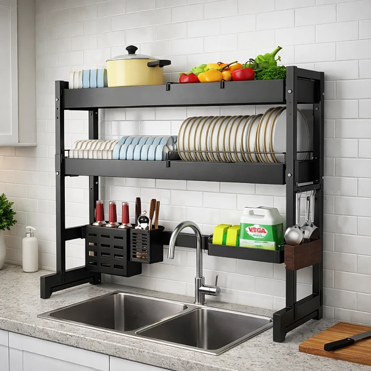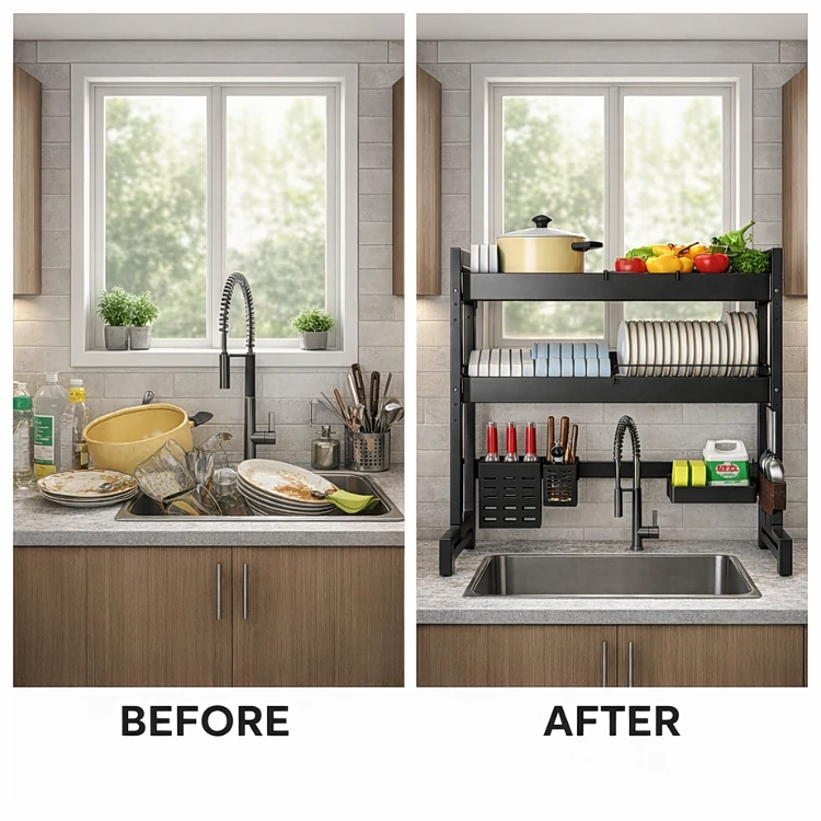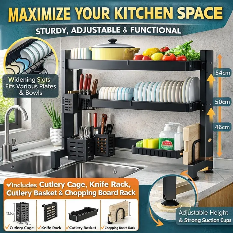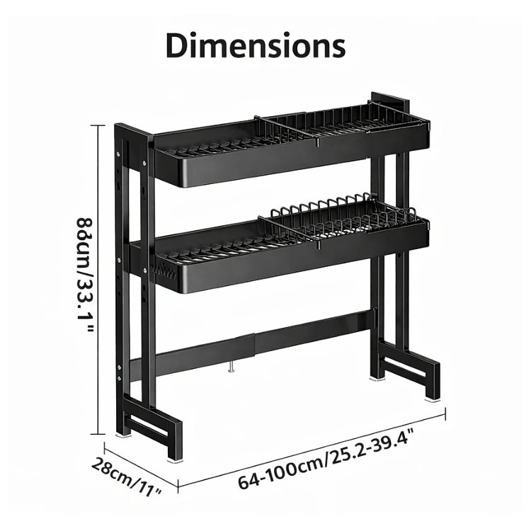 The Double Layer Retractable Over Sink Dish Drying Rack is designed to maximize kitchen space while keeping your dishes and utensils neatly organized. This practical over-sink rack allows you to dry plates, bowls, cups and kitchen tools directly above the sink, helping water drain naturally without wetting your countertop. The double-layer structure provides generous storage space while keeping everything within easy reach.