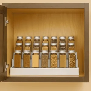 - 3-Layer Stepped Shelves – The raised tier system allows you to easily identify labels on spice jars, bottles, cans, and more.