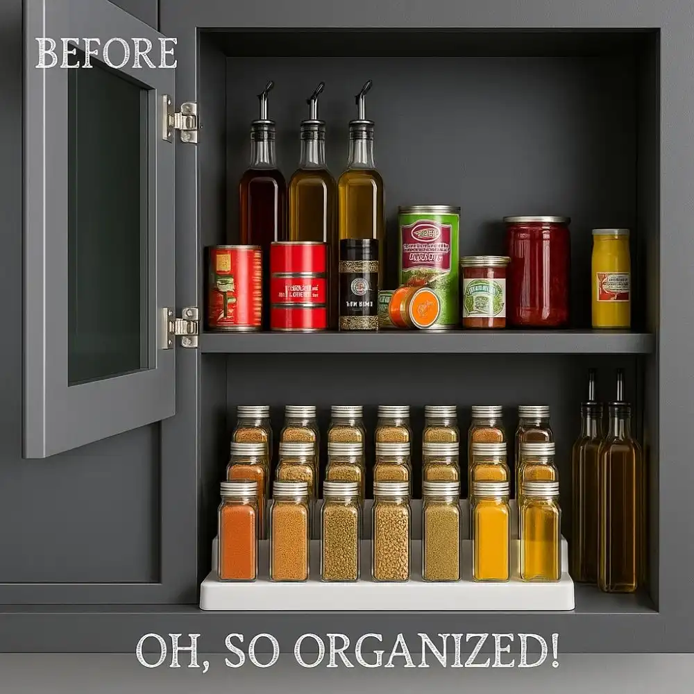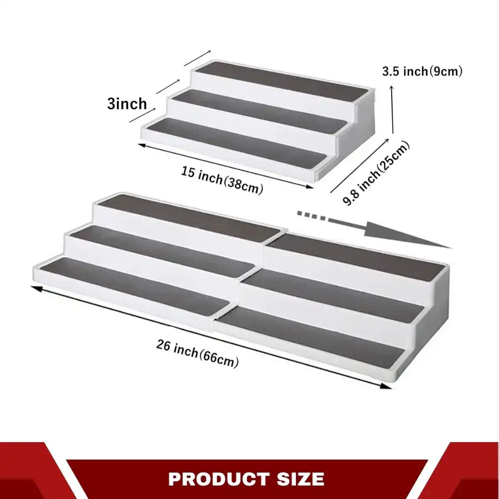 Whether you want to display spice bottles, condiment jars, cans, herb containers, oil bottles, or cosmetic products, this multi-purpose expandable shelf gives you the space and visibility you need. Its three-tier stepped design ensures that every bottle is elevated, making it incredibly easy to identify everything at a glance—no more searching through cluttered shelves!