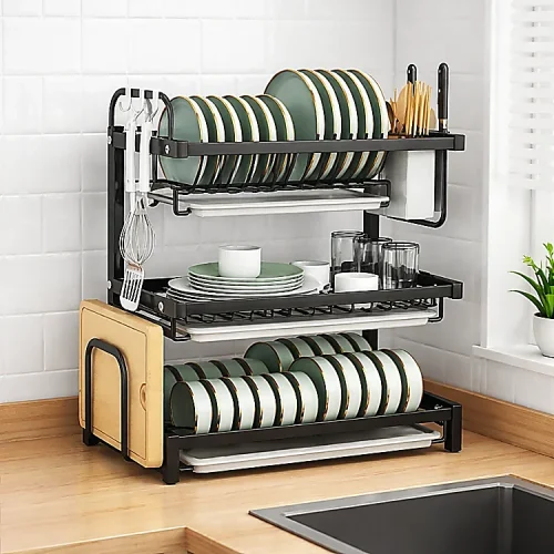 3 LAYER KITCHEN DISH RACK WITH UTENSIL AND CUTTING BOARD HOLDER, STAINLESS STEEL DISH RACK WITH WATER DRAIN TRAY