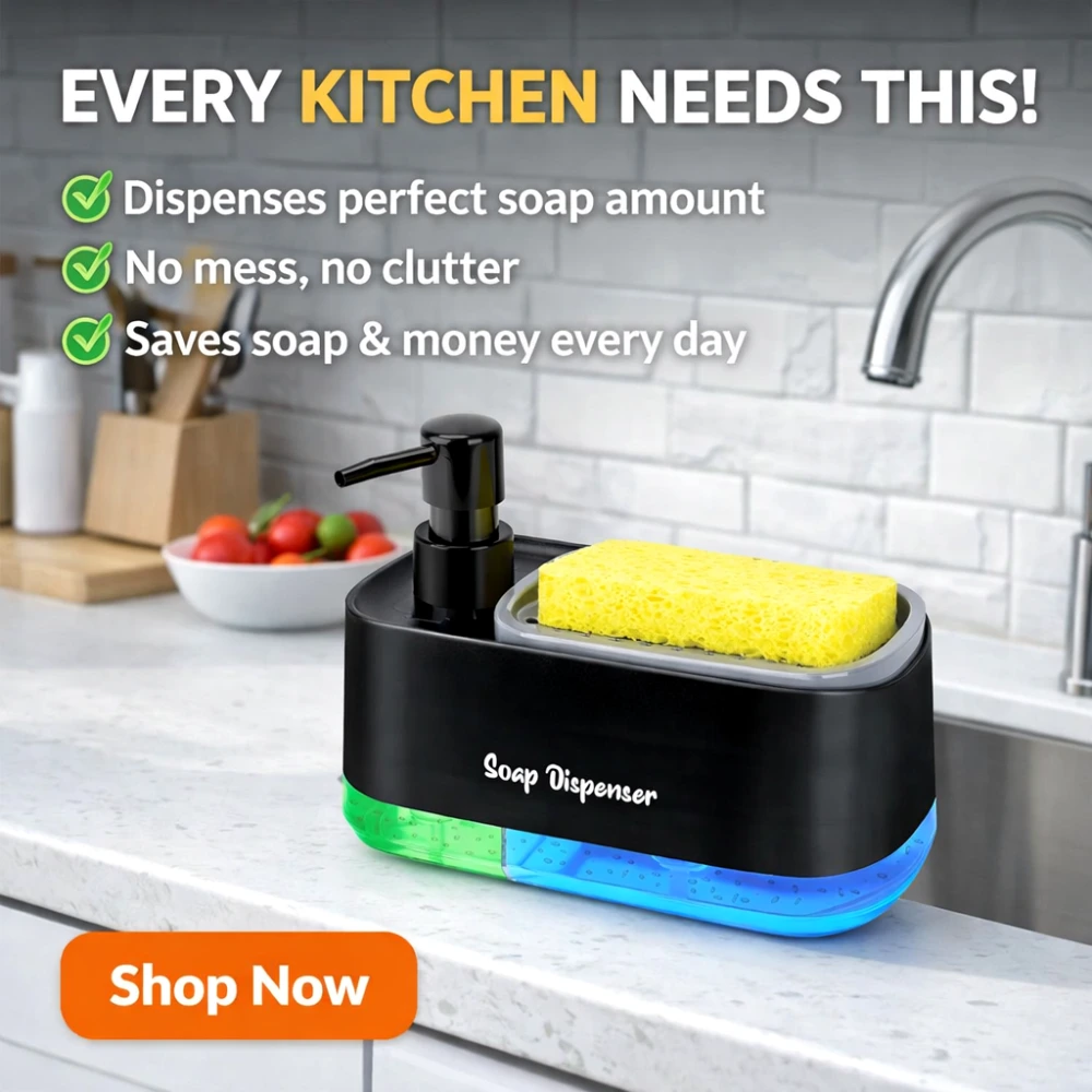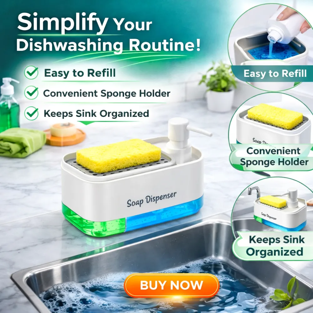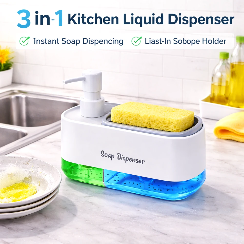 The Kitchen Sponge Holder and Soap Dispenser is a smart 2-in-1 solution designed to simplify your kitchen cleaning routine. This compact unit combines a sponge holder with a built-in liquid soap dispenser, allowing you to keep everything you need in one place. With its clean design and practical function, it helps reduce clutter around your sink while making dishwashing more efficient.