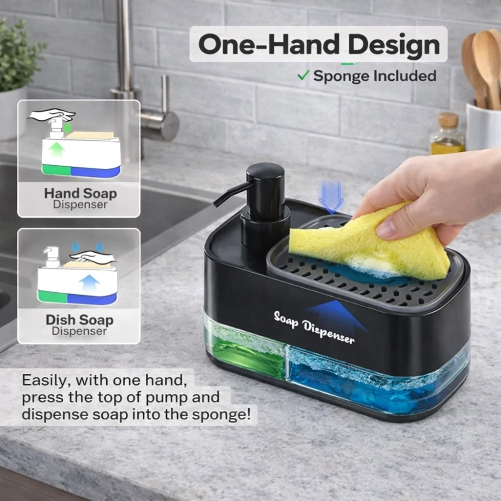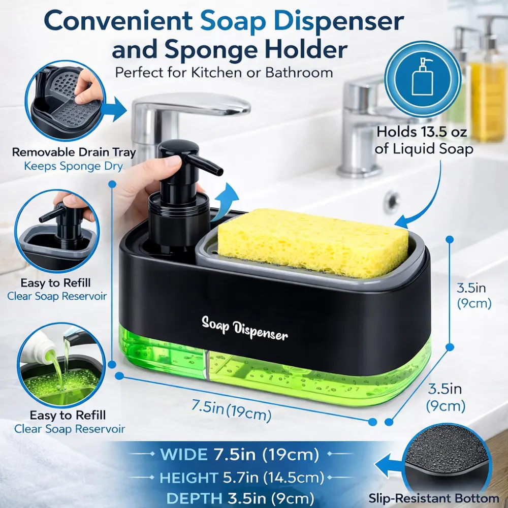 • Design: 2-in-1 sponge holder with built-in soap dispenser