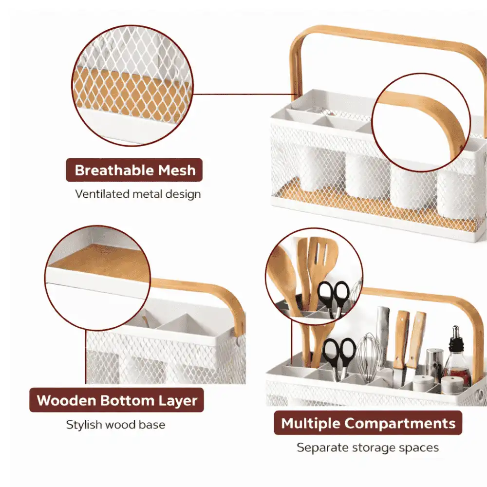 Organize your home in a modern way with this multi compartment mesh wire storage basket made from powder coated metal with a strong wooden handle. This is a stylish kitchen countertop organizer, bathroom vanity organizer, and stationery desk organizer. Available in black powder coated and white powder coated colors with a sturdy, strong build and elegant minimal IKEA style look.