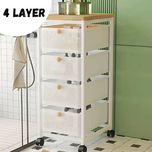 4-LAYER WHITE SLIM STEEL STORAGE RACK | MODERN DRAWER ORGANIZER WITH WOODEN TOP