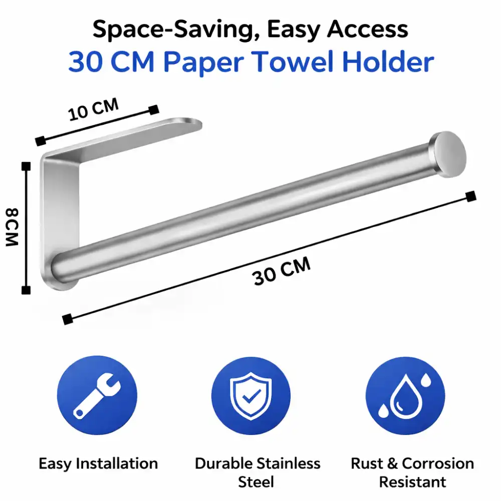 Upgrade your kitchen organization with this sleek stainless steel paper towel holder, designed to keep your essentials within easy reach. Its simple yet modern structure allows it to be mounted under cabinets or on walls, making it a practical addition to any kitchen setup. The smooth rod design holds standard paper towel rolls securely while maintaining a clean and minimal look.