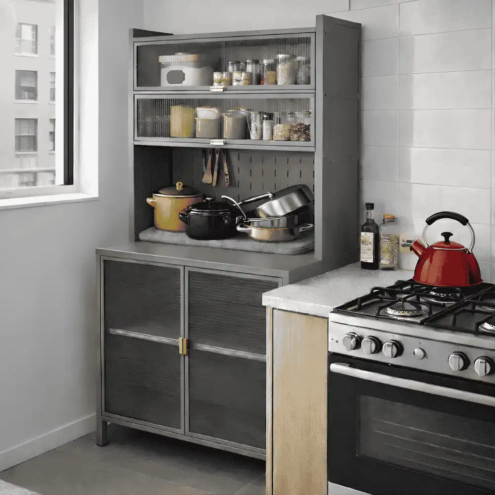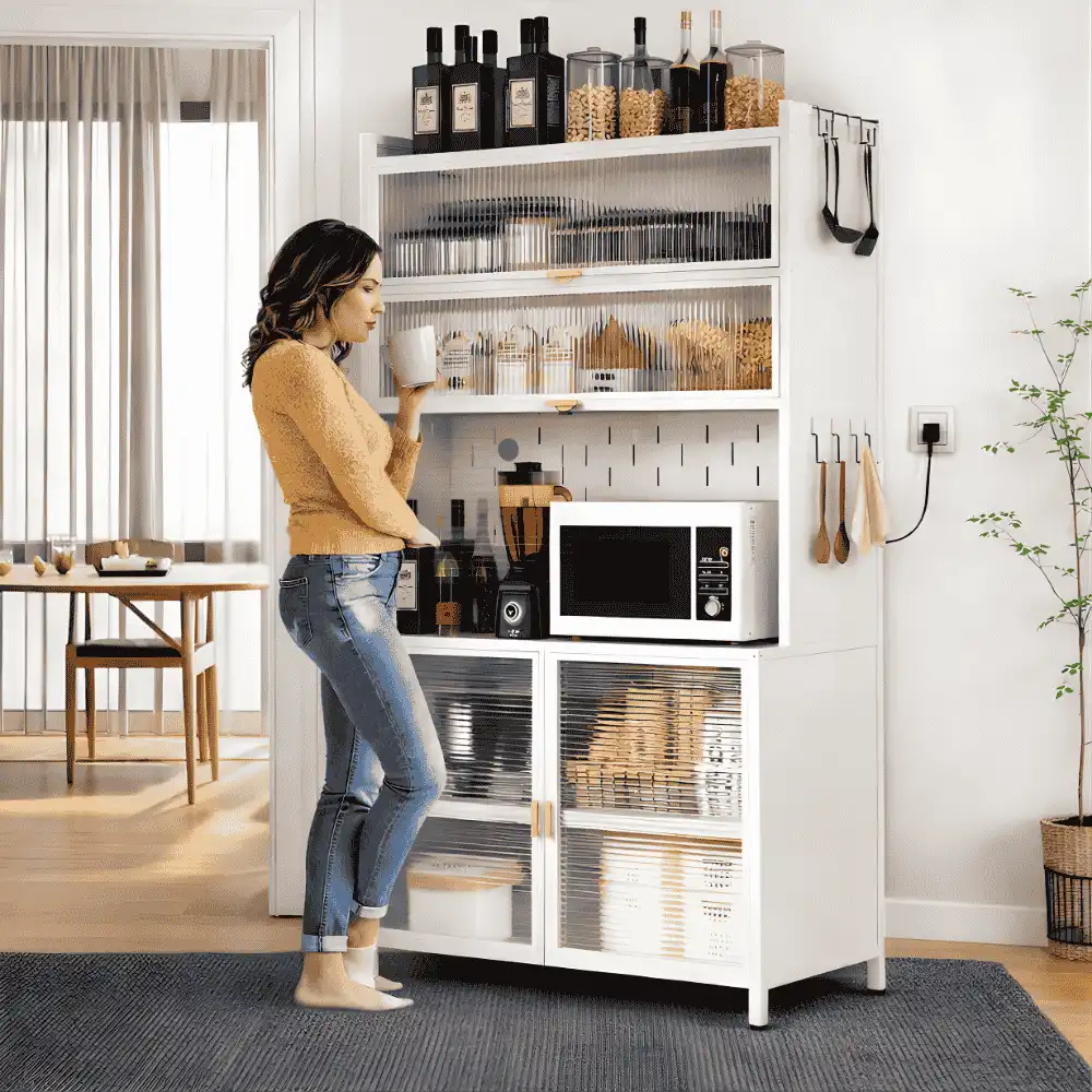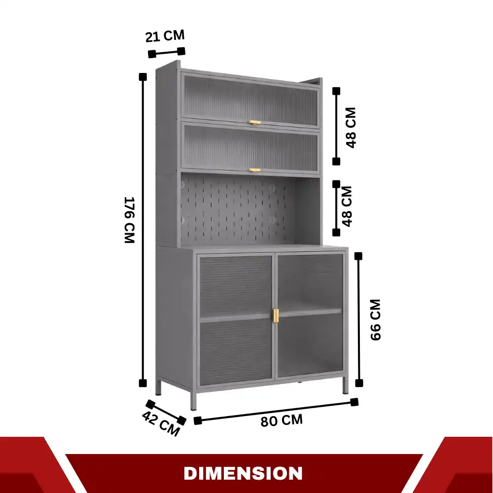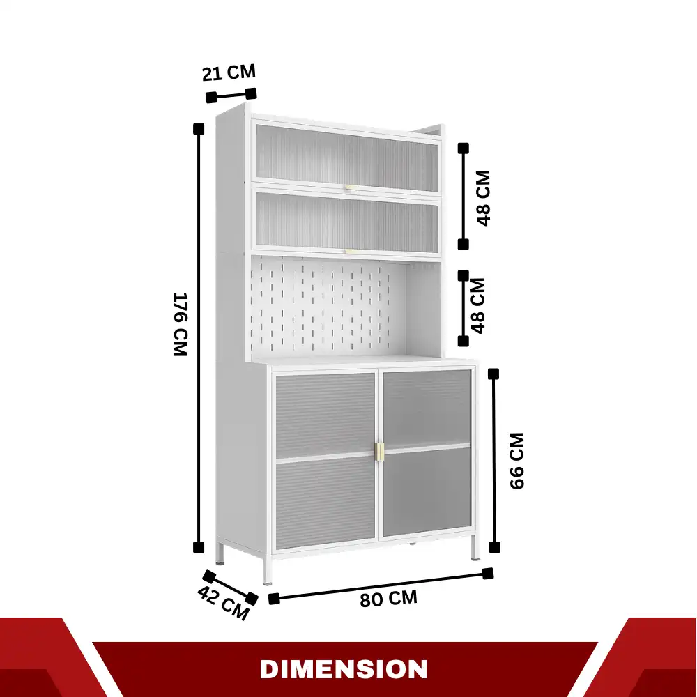 This steel kitchen storage cabinet with wheels is the ultimate solution for your kitchen storage needs. With its durable steel frame and tempered glass doors, it ensures long-lasting use. The cabinet features adjustable shelves and wider countertops, making it perfect for storing cookware, small appliances, and groceries. Its modern design blends seamlessly with any kitchen aesthetic. The 360° rotating wheels make it easy to move, while the dust-proof and insect-proof design ensures your items stay clean and protected. Whether you’re storing dishes, spices, or appliances, this is the perfect kitchen organizer.